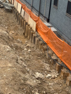 敷地の四方に打ち込まれたシートパイル。土砂の崩壊を防ぐ地下の壁です。