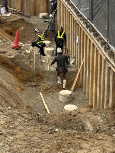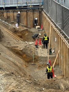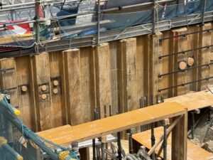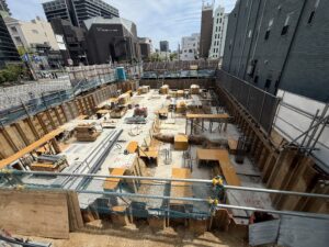 深いところでは最大約3mまで掘り下げます。周囲のシートパイルが地下空間を支えています。