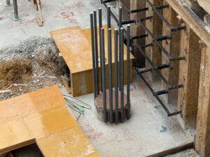 基礎杭を中心に太い鉄筋が組み上げられ、コンクリートと一体化する基礎構造が形になりつつあります。